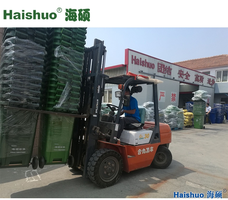 青島海碩HS-240L環衛專用垃圾桶,全面加強的桶身能夠配合汽車升降機,使掛車升降時不破損。