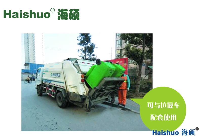青島海碩 HS-120L-A-1環(huán)衛(wèi)垃圾桶,全面加強(qiáng)的桶身能夠配合汽車升降機(jī),使掛車升降時(shí)不破損。
