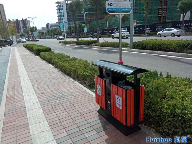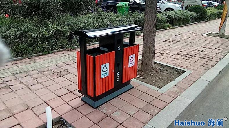 青島海碩鋼木戶外垃圾箱HS-325,與普通垃圾桶比較而言,增加了桶身的強(qiáng)度,使之經(jīng)久耐用,并且美觀好看
