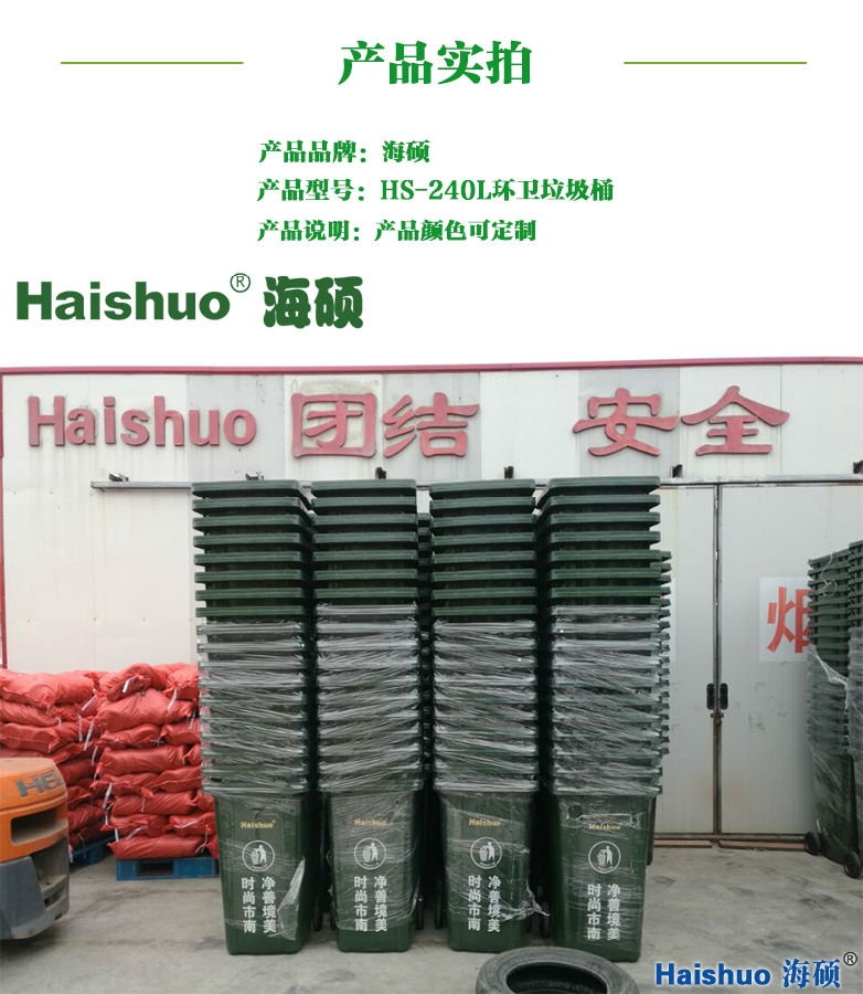 HS-240L環(huán)衛(wèi)垃圾桶 詳細(xì)說明:海碩HS-240L環(huán)衛(wèi)垃圾桶,采用全新高密度聚乙烯HDPE磨具壓制成型,可與專用垃圾收集車配套使用。1、桶身沿口加強(qiáng)筋的設(shè)計(jì)布局,使此款垃圾桶比普通垃圾桶承重能力更強(qiáng)大。2、海碩家的桶身前后承力部分有豎向加強(qiáng)筋,底部同樣加厚加強(qiáng)。3、本產(chǎn)品采用全新高密度聚乙烯,使垃圾桶耐老化,抗沖擊力有了更大的提升。