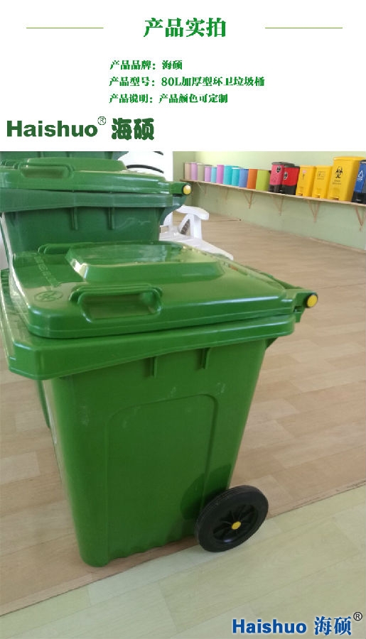 80L加厚型環(huán)衛(wèi)垃圾桶詳細(xì)說(shuō)明:80L加厚型環(huán)衛(wèi)垃圾桶,采用全新高密度聚乙烯HDPE磨具壓制成型,可與專用垃圾收集車(chē)配套使用。1、桶身沿口加強(qiáng)筋的設(shè)計(jì)布局,使此款垃圾桶比普通垃圾桶承重能力更強(qiáng)大。2、海碩家的桶身前后承力部分有豎向加強(qiáng)筋,底部同樣加厚加強(qiáng)。3、本產(chǎn)品采用全新高密度聚乙烯,使垃圾桶耐老化,抗沖擊力有了更大的提升。