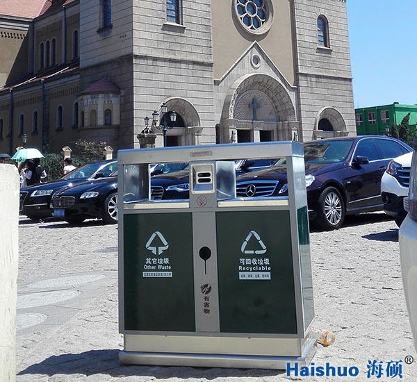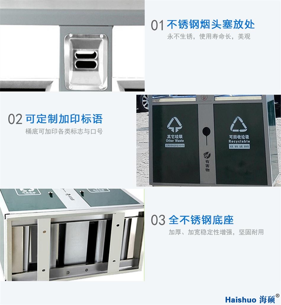 HS-B201不銹鋼果皮箱,采用優良的工業201#不銹鋼裁剪、壓制、折彎后再焊接而成型,內膽是鍍鋅板/玻璃鋼,色內桶麗美觀,具有防腐、防盜、防生銹、易清潔等特點。其中,HS-B201蓋頂采用的是整體液壓成型工藝,弧形設計,提高產品的時尚性與使用安全性;在煙頭塞口處使用加厚不銹鋼,不傷手,永不生銹,使用壽命長,美觀;在垃圾投放口部分做了斜角處理,內筒與投放口高度結合,使得垃圾更容易入桶,而清潔工人更方便清理等優點。