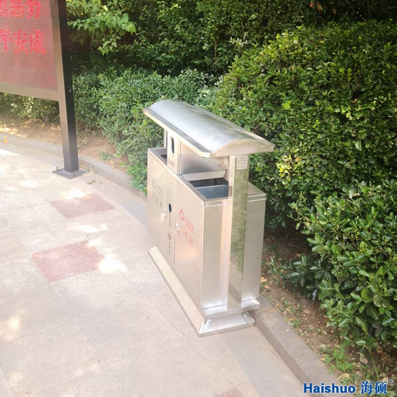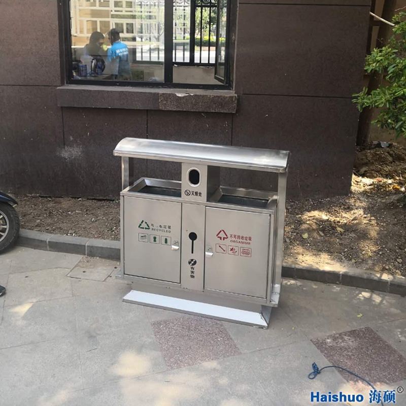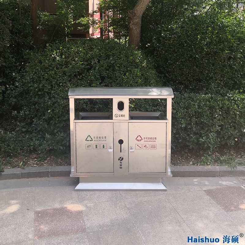 海碩環保分類果皮箱亮相城陽區華胥美邦物業,一款采用不銹鋼制作的雙桶分類垃圾桶,防腐、防銹,整體整潔明亮,其功能分為可回收垃圾收集和不可回收垃圾收集以及滅煙處,其優點標識明顯,簡潔美觀,一款不生銹的果皮箱,并對垃圾分類宣傳起到一定的推廣作用,適用于街道社區、大型商場、景區公園、地鐵站臺等。