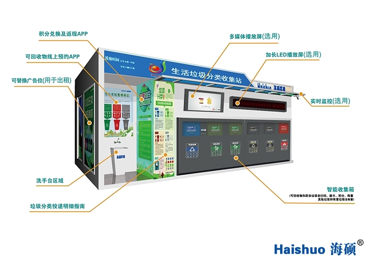 【主要功能】:垃圾稱(chēng)重功能、線上APP積分兌換、多媒體宣傳服務(wù)、投放后洗手清潔、防雨、照明、監(jiān)控還具有殺菌、除蟲(chóng)、除臭功能等。