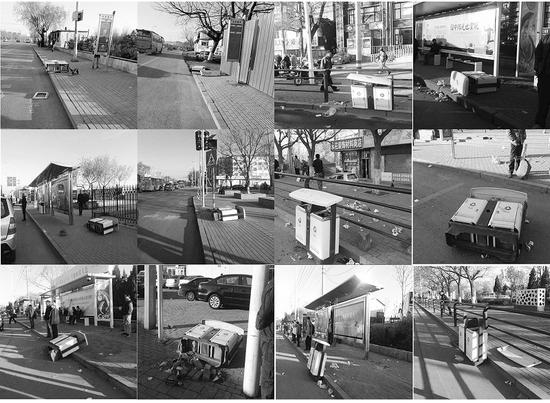4月21日上午,街道辦事處工作人員在事發現場張前路、虹港路路段幾個公交車站看到,有4個垃圾箱被人推倒,歪斜地躺在草地上,地磚也被撬起。被推倒的垃圾箱有的已嚴重變形,有的雖從正面看完好無損,但后蓋已經扭曲變形,人為破壞的跡象明顯。