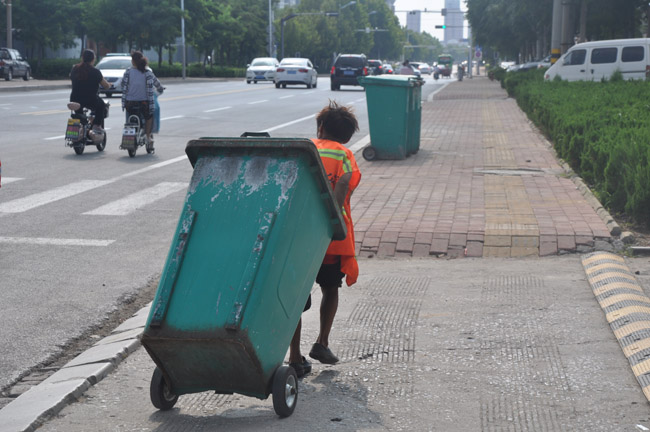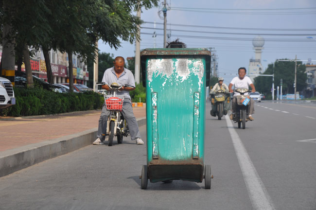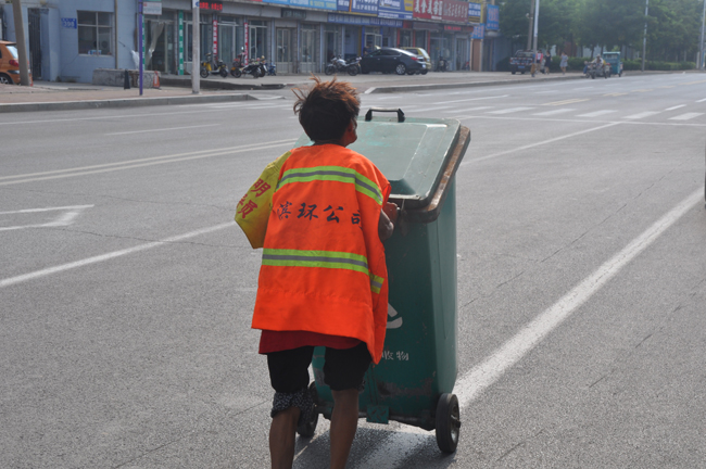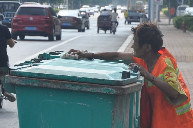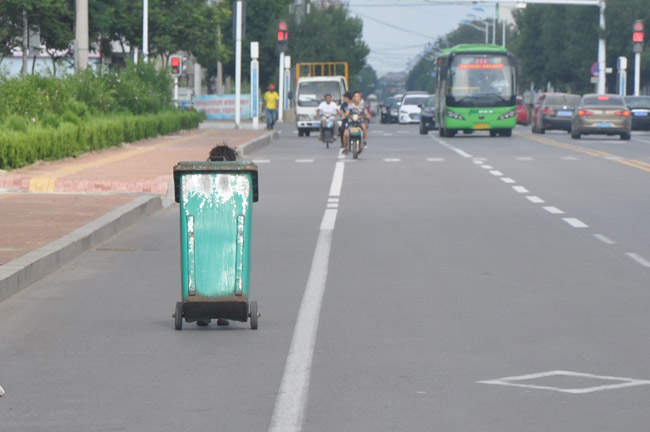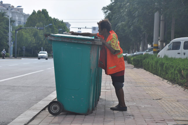 濱州街頭心酸一幕 65歲老人推著垃圾桶艱難前行