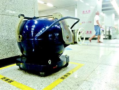 昨日上午11時(shí)許,楚天都市報(bào)記者在王家灣地鐵站看到,重達(dá)750kg的防爆球披著藍(lán)色外衣,球體一側(cè)寫(xiě)有醒目的“防爆球”字樣,另一側(cè)則安裝了一個(gè)可以轉(zhuǎn)動(dòng)的方向輪盤(pán),從外形上看,很容易就能分辨出這并不是垃圾桶。除此之外,地鐵站工作人員用黃色警示線將防爆球所在區(qū)域單獨(dú)分隔開(kāi)來(lái)。