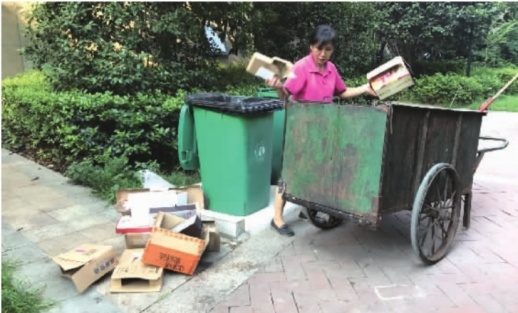當問及物業是否要求保潔人員對垃圾進行分類處理時,他表示并沒有這樣的要求,個別保潔分類也只是將可賣物挑出自行變賣。“一方面是因為有的居民并沒有做到垃圾分類,導致垃圾又混在了一起。另一方面是因為運送垃圾的垃圾車就是一個大空間,沒有分類空間。還有就是垃圾中轉站也沒有垃圾分類放置設備,所以就算分類運輸了,到垃圾站也還是要混合堆積的。”