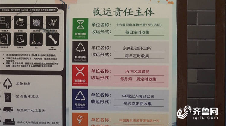 垃圾桶旁的標識牌上,明確標有分類垃圾的清運工作負責主體。據歷下區東關街道城管科垃圾分類工作負責人宋鵬介紹,“每個月第一個星期歷下區城管局會對有害垃圾進行定時收集處理,廚余垃圾則是每日收集清運!