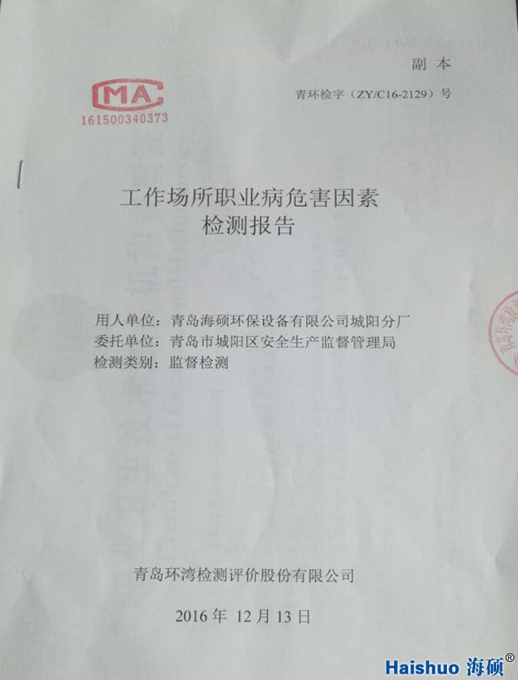 青島市城陽區安全生產監督管理局組織的工作場所職業病危害檢測,青島海碩環保設備有限公司城陽分廠順利通過檢測。